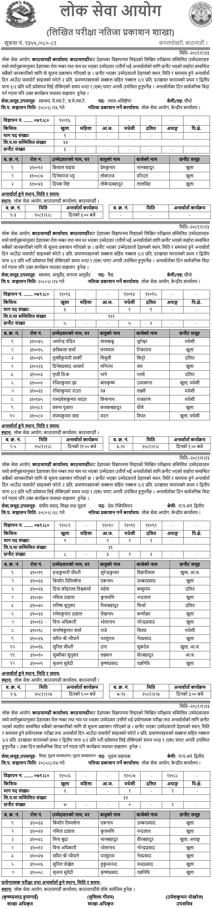 This notice is published for the information of all concerned about how the candidates with the following roll numbers and surnames have passed the written examination taken in the following advertisement from the Public Service Commission, Kathmandu Office, Kathmandu in alphabetical order and have been selected for the practical examination and interview. When the selected candidates come for the practical test and interview at the following place, date, and time, take 2 copies of passport size photograph, 2/2 copies of certificates along with duplicates, 2/2 copies of the first and second page of the application form by taking the admit card 1 (one) before the specified time. ) should be present before hours. Even if that day falls on a public holiday, the program will continue as usual.
