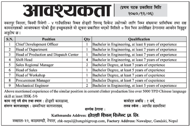 Above mentioned experience of the similar position in cement clinker production line over 5000 TPD Chinese language skill at least HSK-5/6
